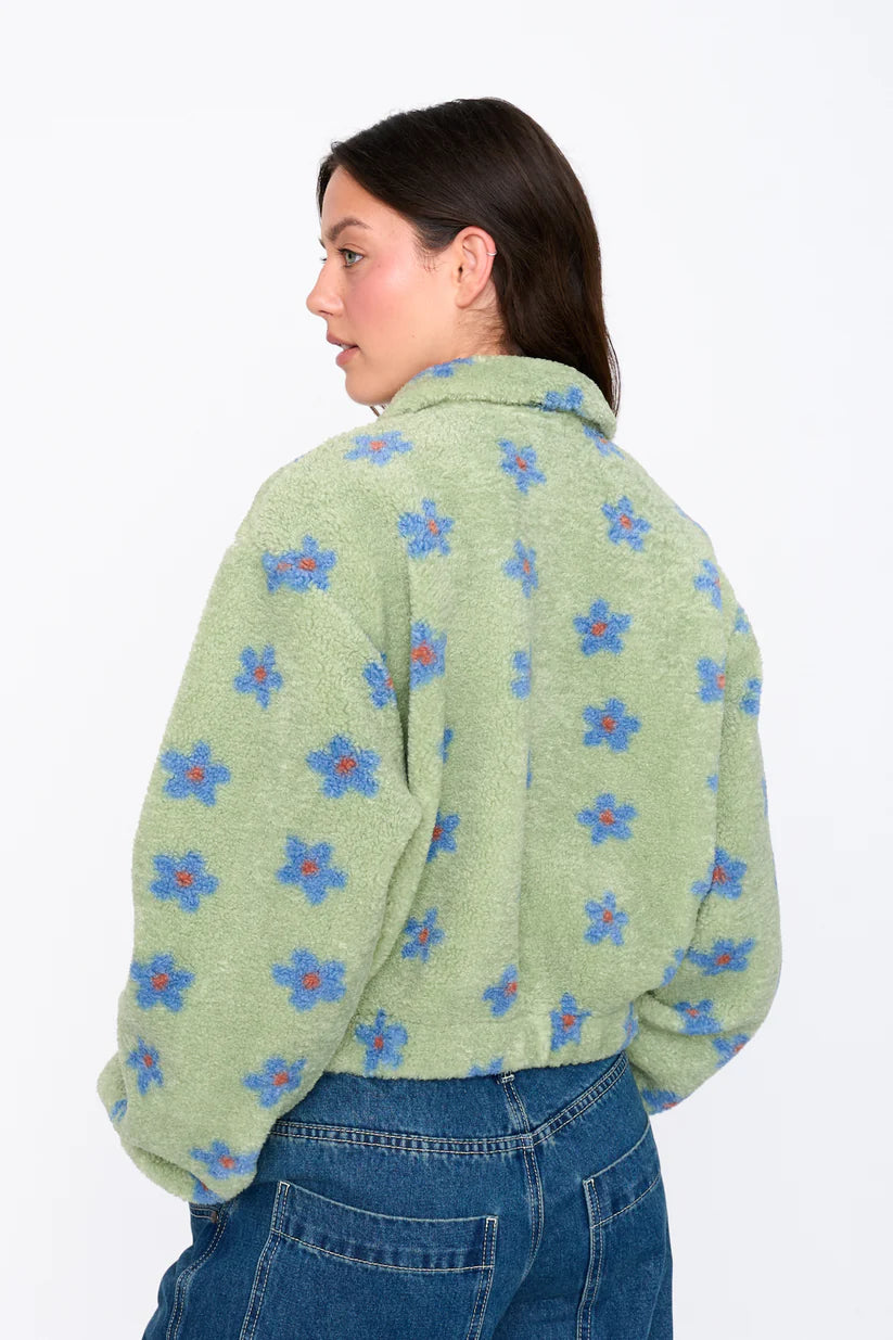 Fleecetrui met bloemetjesprint. De trui heeft een kraag met rits, elastieken boorden aan mouwen en onderkant van de trui en twee insteekzakken.