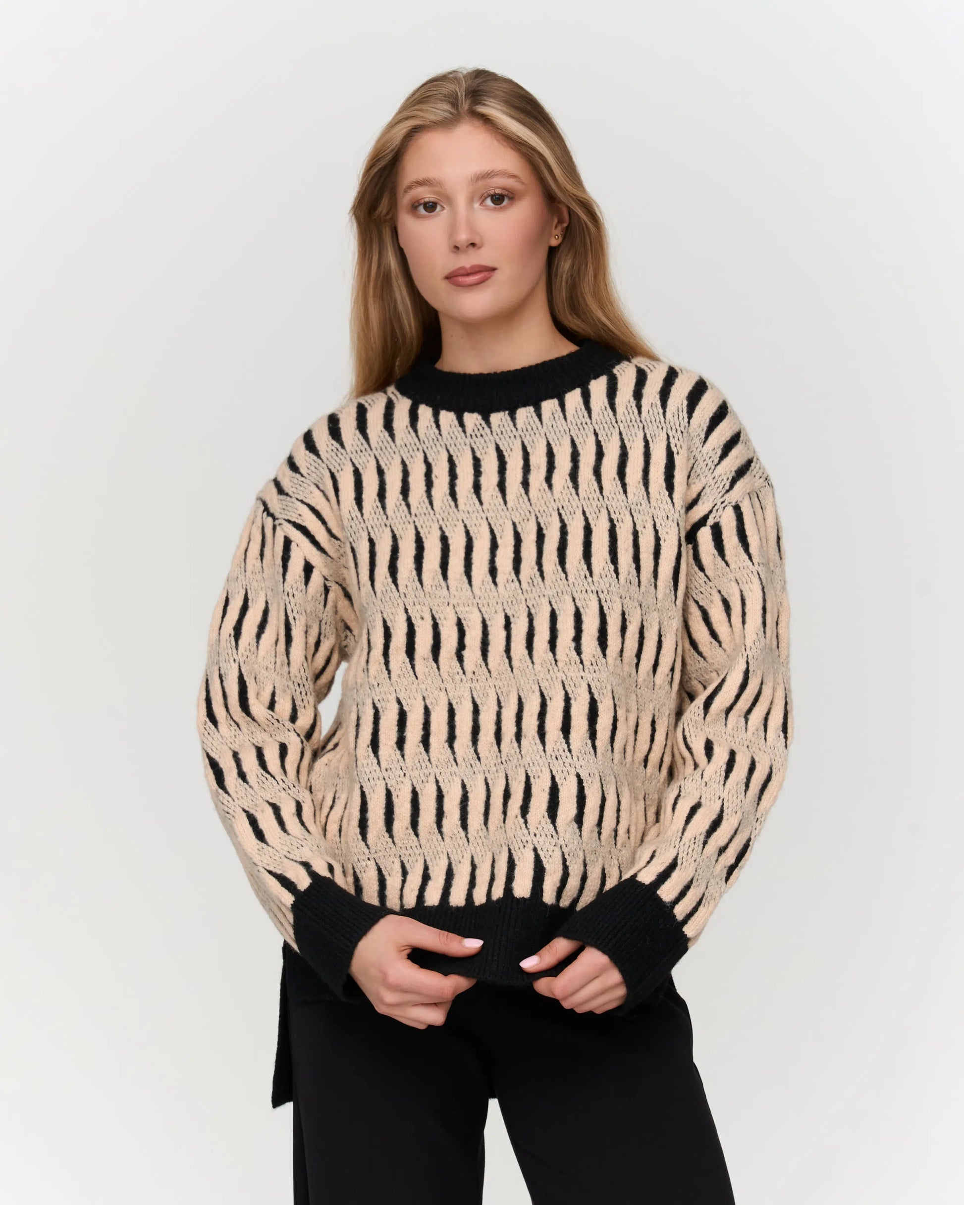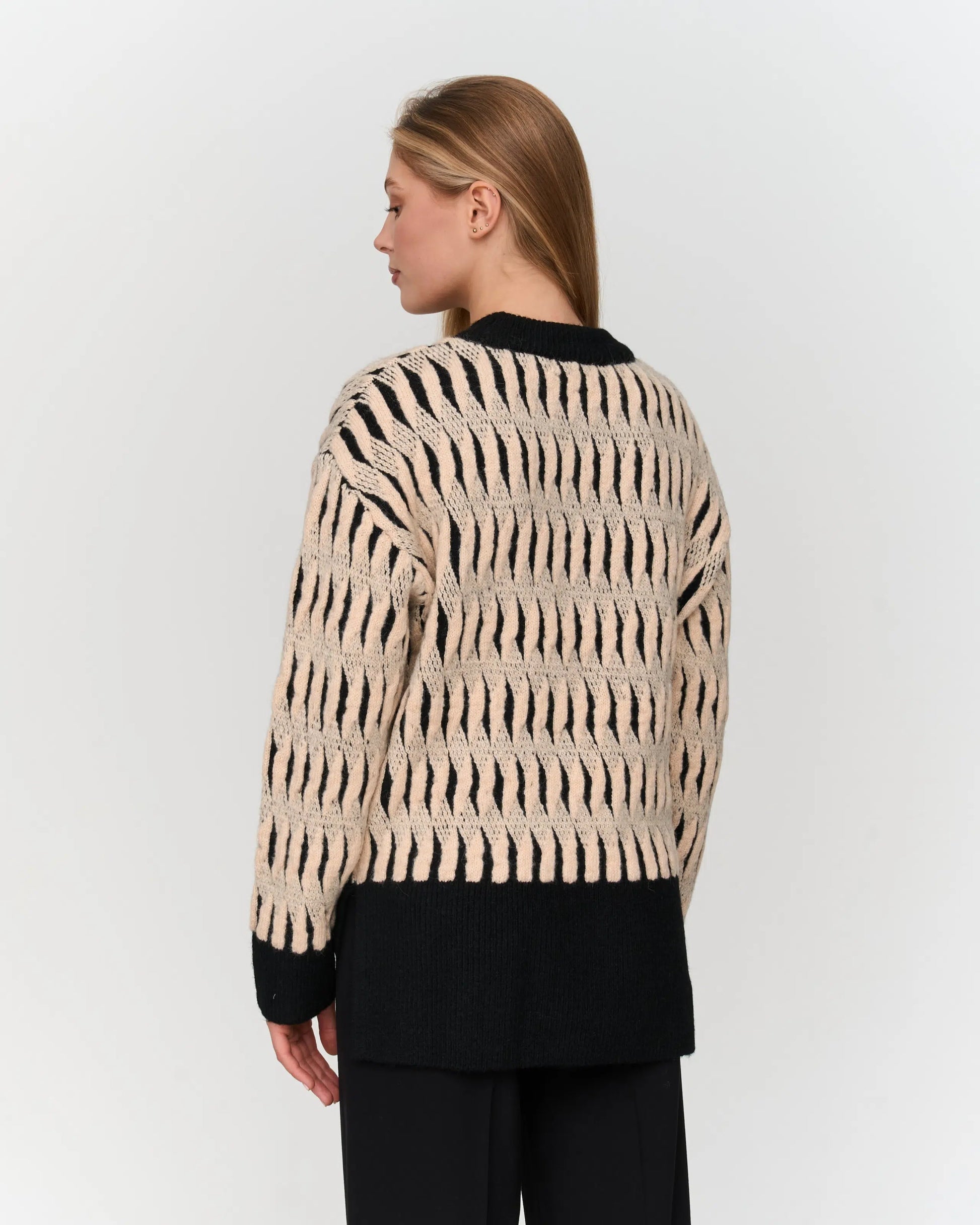 Trui met leuk patroon. De onderste boord is aan de achterkant langer dan aan de voorkant en aan beide zijden zit een splitje.