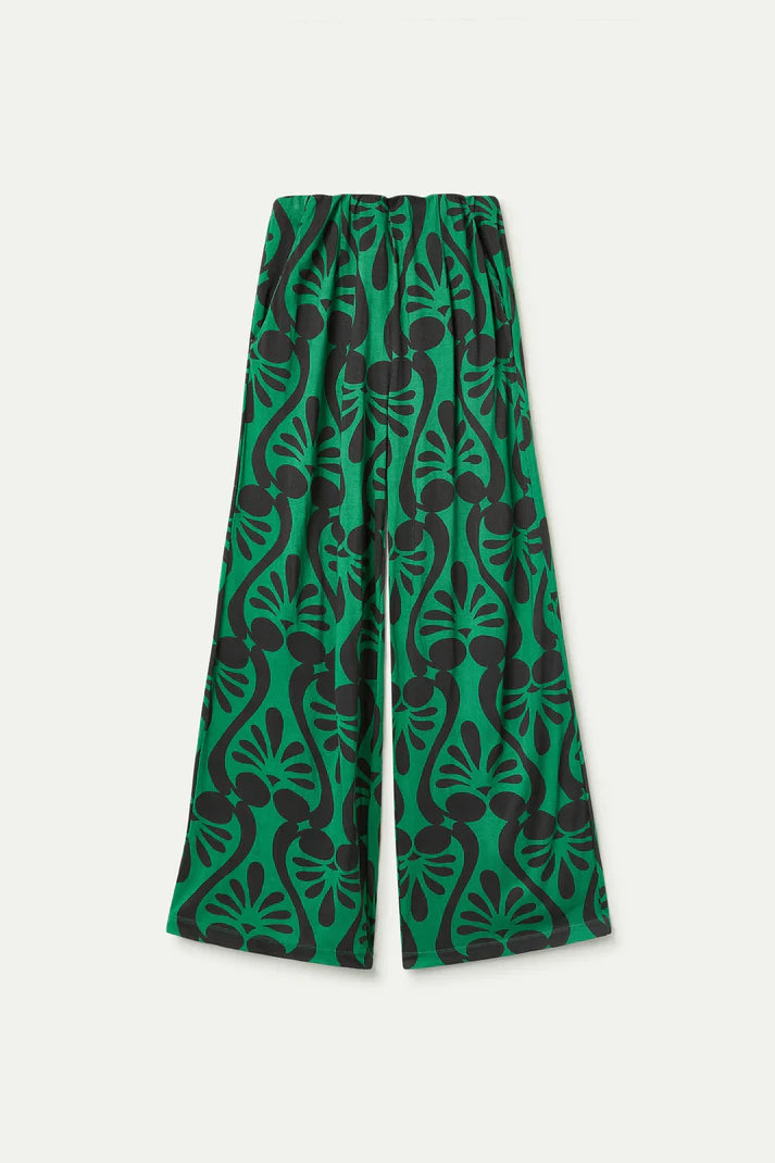 Groene pantalon met baroque-print. Middelhoge taille met elastische tailleband. Rechte pijpen en steekzakken.