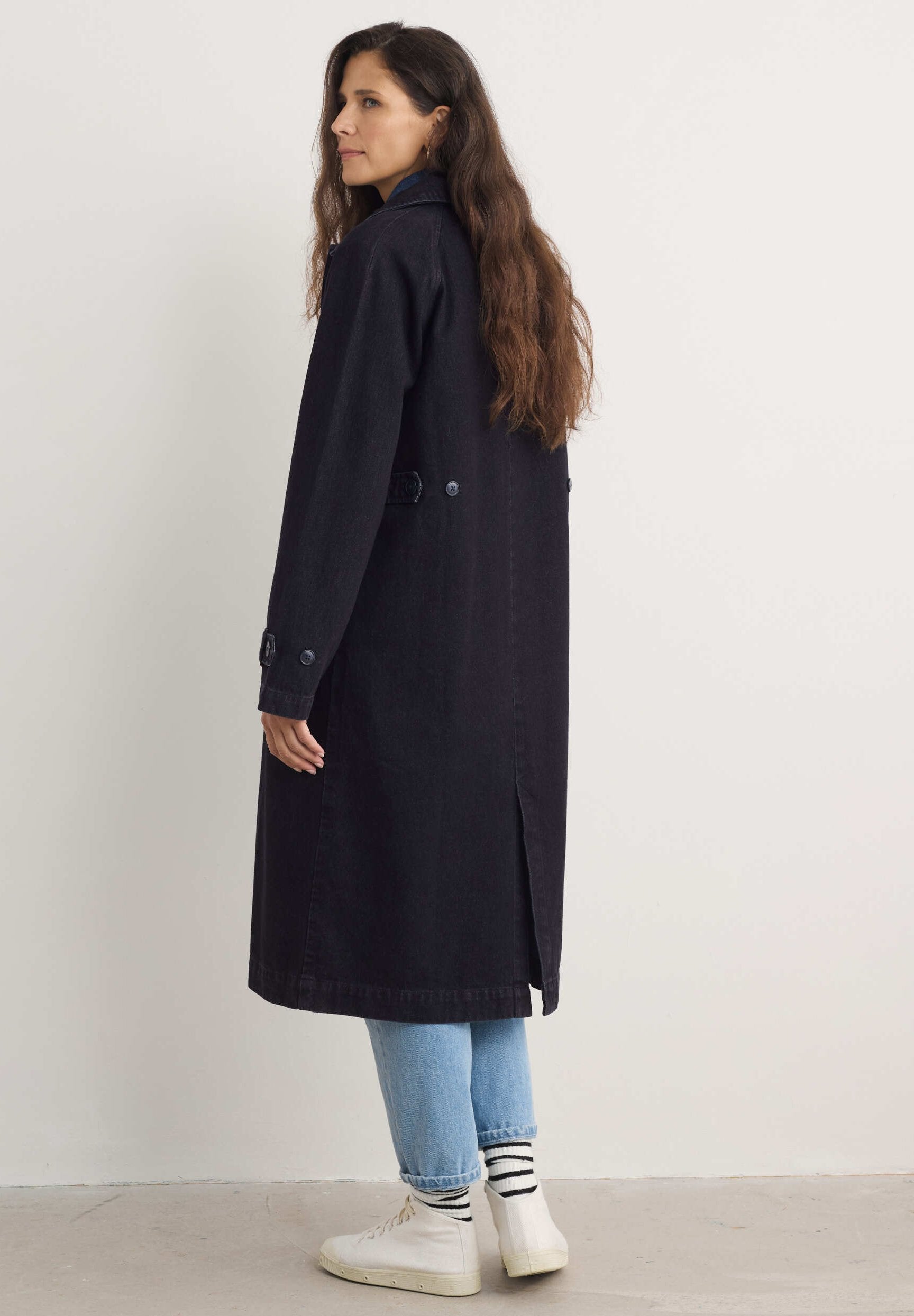 Een echt veelzijdig kledingstuk dat je het hele jaar door zult dragen. Deze lange jas van biologisch katoen heeft een klassieke kraag, knopen van imitatiehoorn aan de voorkant en bij de manchetten, en schuine zakken. Gebruik de verstelbare bandjes aan de achterkant van de taille om de pasvorm aan te passen. Perfect om een outfit af te maken!